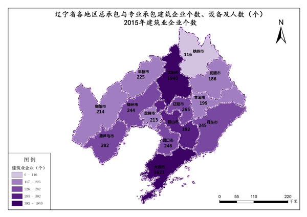 辽宁省2015年建筑业企业个数最高值是沈阳市,数值为1940个,最低值是铁岭市,数值为116个。各市的建筑业企业个数总和是6388个,各市平均值为456个