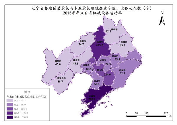 辽宁省2015年年末自有机械设备总功率最高值是大连市,数值为798.8万千瓦,最低值是阜新市,数值为24.7万千瓦。各市的年末自有机械设备总功率总和是2097.1万千瓦,各市平均值为149.8万千瓦。