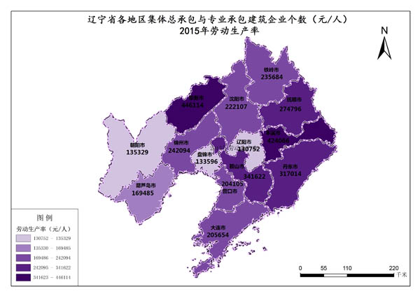 辽宁省2015年劳动生产率最高值是阜新市,数值为446114元/人,最低值是锦州市,数值为130752元/人。各市平均值为248744.14元/人。