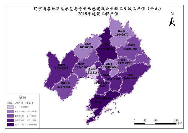 辽宁省2015年建筑工程产值最高值是大连市,数值为179049840千元,最低值是盘锦市,数值为12118167千元。各市的建筑工程产值总和是659140608千元,各市平均值为47081472千元。