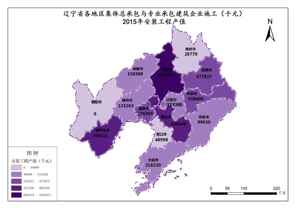 辽宁省2015年安装工程产值最高值是沈阳市,数值为3303471千元,最低值是铁岭市,数值为28770千元。各市的安装工程产值总和是6880713千元,各市平均值为529285.6154千元。