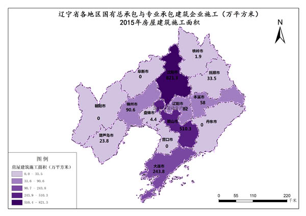 辽宁省2015年房屋建筑施工面积最高值是沈阳市,数值为821.3万平方米,最低值是铁岭市,数值为1.9万平方米。各市的房屋建筑