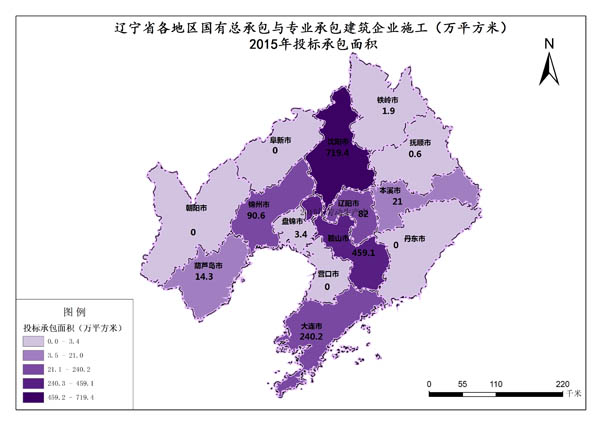 辽宁省2015年投标承包面积最高值是沈阳市,数值为719.4万平方米,最低值是抚顺市,数值为0.6万平方米。各市的投标承包面积总和是1632.5万平方米,各市平均值为163.2万平方米。