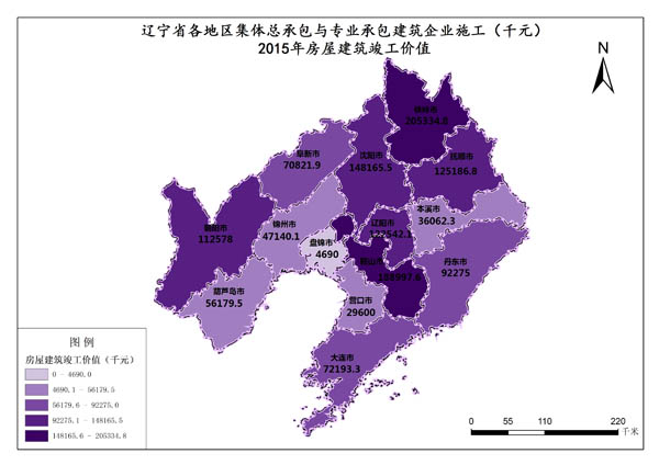 辽宁省2015年房屋建筑竣工价值最高值是铁岭市,数值为205334.8千元,最低值是盘锦市,数值为4690千元。各市的房屋建筑竣工价值总和是1311766.9千元,各市平均值为93697.63571千元。