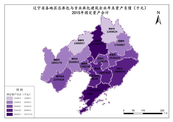 辽宁省2015年固定资产合计最高值是沈阳市,数值为19772719千元,最低值是铁岭市,数值为1269624千元。各市的固定资产合计总和是63602238千元,各市平均值为4543017千元。