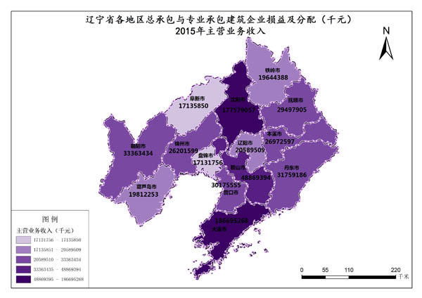 辽宁省2015年主营业务收入最高值是沈阳市,数值为186695268千元,最低值是盘锦市,数值为17131756千元。各市的主营业务收入总和是685427751千元,各市平均值为388124.1千元。