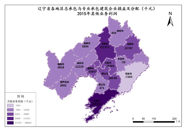 辽宁省2015年其他业务利润最高值是大连市,数值为239223千元,最低值是丹东市,数值为-7265千元。各市的其他业务利润总和是482645千元,各市平均值为34474.64286千元。