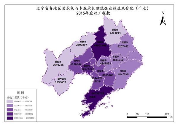 辽宁省2015年应收工程款是大连市,数值为48601706千元,最低值是朝阳市,数值为2640725千元。各市的利润总额总和是25442407千元,各市平均值为1817314.786千元。