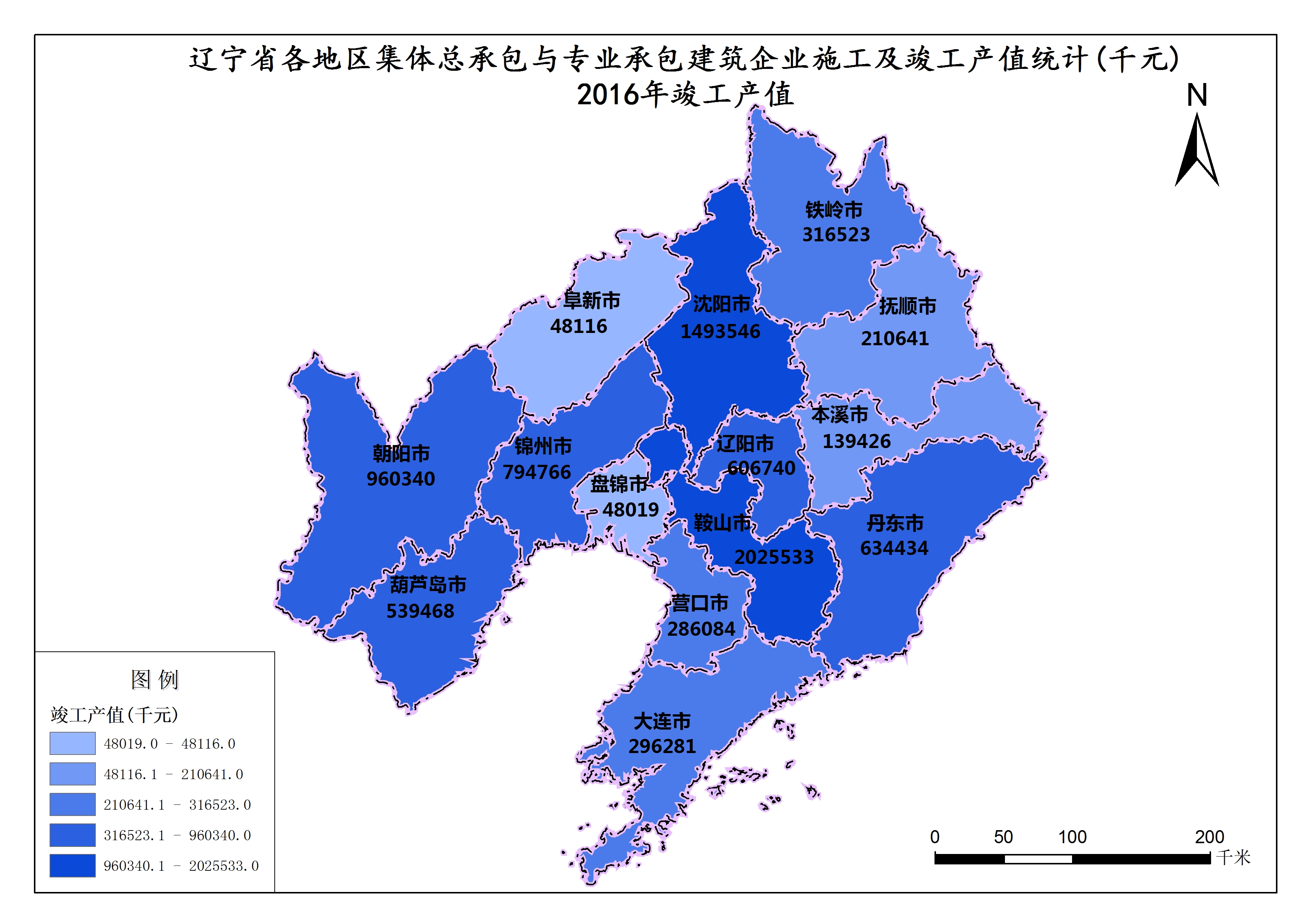 辽宁省2016年竣工产值 沈阳市最多为1493546千元,平均值为599994千元