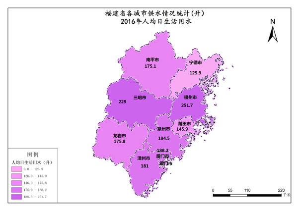 福建省2016年人均日生活用水量最高值是福州市,数值为251.74升,最低值是宁德市,数值为125.88升。各市的人均日生活用水量总和是1657.17升,各市平均值为184.13升。