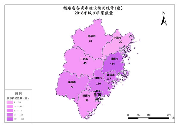 福建省2016年城市桥梁数量最高值是厦门市,数值为469座,最低值是宁德市,数值为20座。各市的城市桥梁数量总和是1402座,各市平均值为155座。