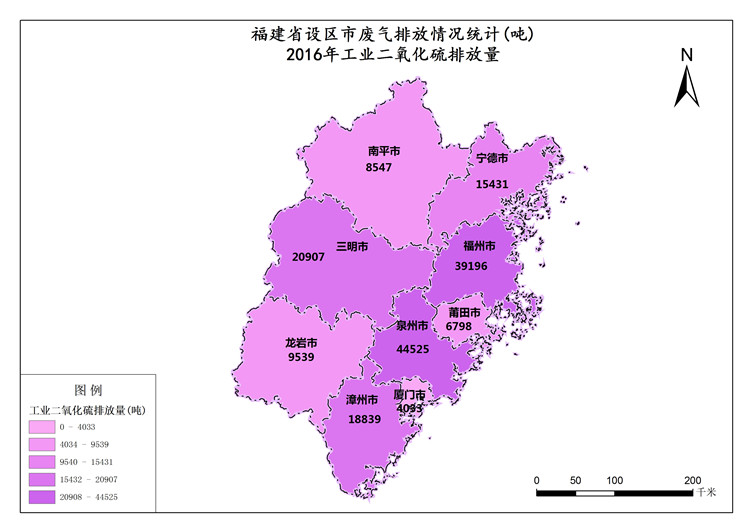 福建省2016年工业二氧化硫排放量最高值是泉州市,数值为44525吨,最低值是厦门市,数值为4033吨。各市的工业二氧化硫排放量总和是166715吨,各市平均值为18646.11吨。