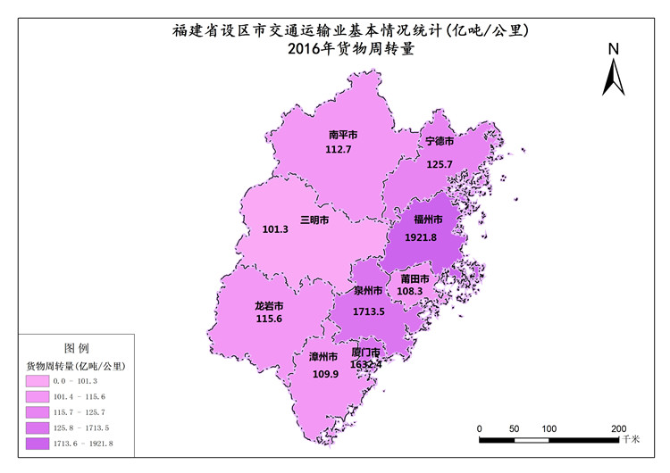 福建省2016年货物周转量最高值是福州市,数值为1921.8亿吨/公里,最低值是三明市,数值为101.3亿吨/公里。各市的货物周转量总和是6130.6亿吨/公里,各市平均值为613.06亿吨/公里。