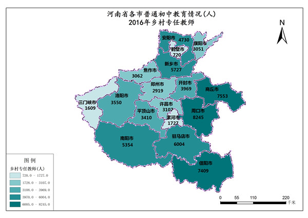 河南省2016年乡村专任教师最高值是周口市,数值为8245人,最低值是鹤壁市,数值为720人。各市乡村专任教师总和是72146人,平均值为4243人。