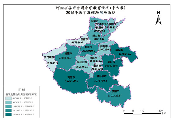 河南省2016年教学及辅助用房面积最高值是南阳市,数值为4025410平方米,最低值是鹤壁市,数值为607990平方米。各市教学及辅助用房面积总和是34130753平方米,平均值为2007691平方米。