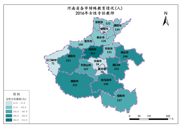 河南省2016年女性专任教师最高值是郑州市,数值为314人,最低值是鹤壁市,数值为34人。各市女性专任教师总和是2661人,平均值为156人。