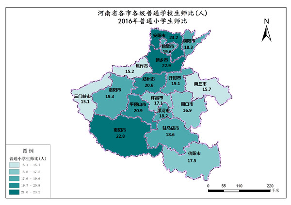 河南省2016年普通小学生师比最高值是安阳市,数值为23.16人,最低值是三门峡市,数值为15.10。各市普通小学生师比总和是321.08人,平均值为18.88人。