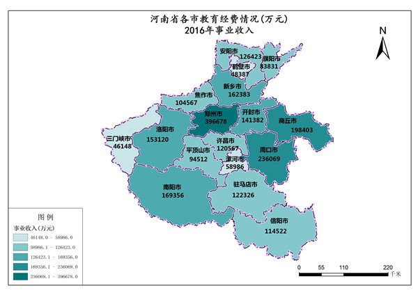 河南省2016年事业收入最高值是郑州市,数值为396678万元,最低值是三门峡市,数值为46148万元。各市事业收入总和是2377660万元,平均值为139862万元。