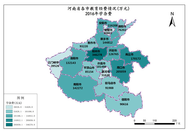 河南省2016年学杂费最高值是郑州市,数值为346278万元,最低值是三门峡市,数值为39526万元。各市学杂费总和是2054332万元,平均值为120843万元。