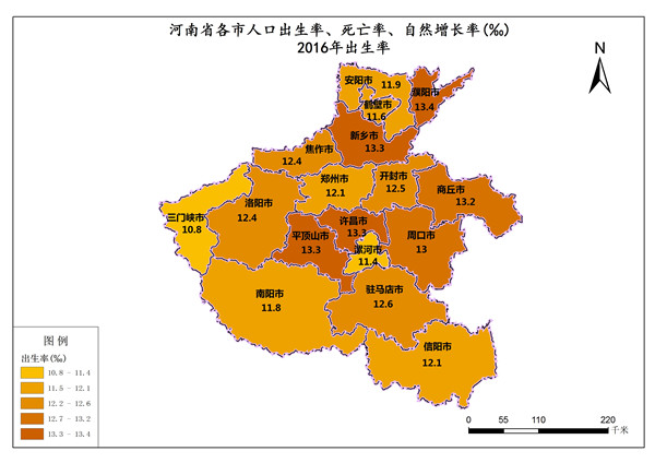 河南省2016年出生率最高值是濮阳市,数值为13.36%,最低值是三门峡市,数值为10.81%。各市出生率总和是211.01%,平均值为12.41%。