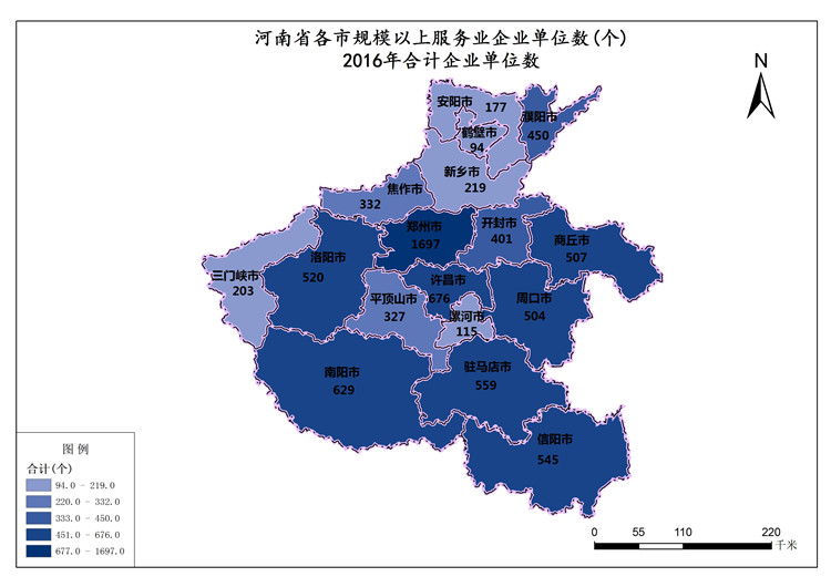 河南省2016年服务业企业合计单位数最高值是郑州市,数值为1697个,最低值是鹤壁市,数值为94个。各市服务业企业合计单位数总和是7955个,平均值为467个。