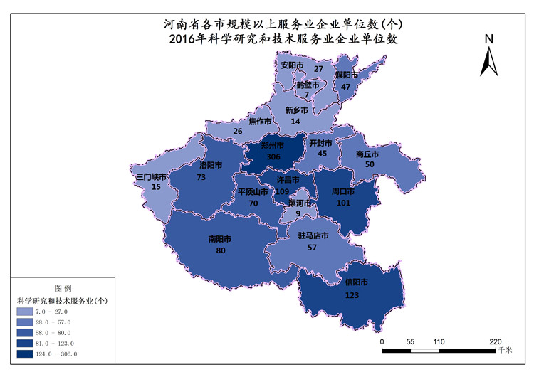 河南省2016年科学研究和技术服务业单位数最高值是郑州市,数值为306个,最低值是鹤壁市,数值为7个。各市科学研究和技术服务业单位数总和是1159个,平均值为68个。