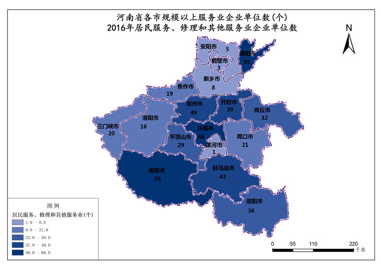 河南省2016年居民服务、修理和其他服务业单位数最高值是郑州市,数值为49个,最低值是漯河市,数值为1个。各市居民服务、修理和其他服务业单位数总和是498个,平均值为29个。