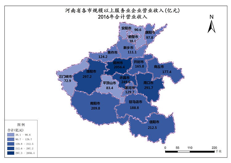 河南省2016年营业收入最高值是郑州市,数值为2056.45亿元,最低值是鹤壁市,数值为38.06亿元。各市营业收入总和是4597.05亿元,平均值为270.41亿元。