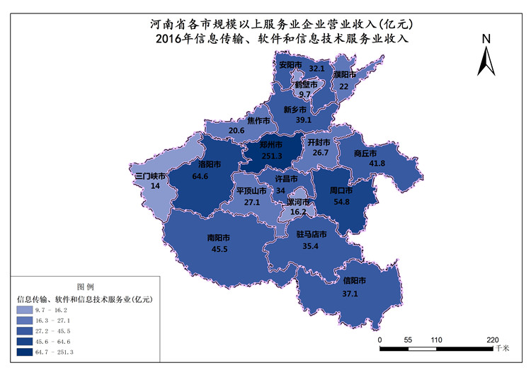 河南省2016年信息传输、软件和信息技术服务业收入最高值是郑州市,数值为251.32亿元,最低值是鹤壁市,数值为9.68亿元。各市信息传输、软件和信息技术服务业收入总和是772.02亿元,平均值为45.41亿元。