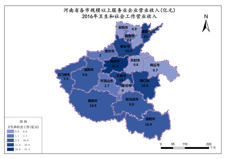 河南省2016年卫生和社会工作营业收入最高值是郑州市,数值为31.39亿元,最低值是商丘市,数值为0.66亿元。各市卫生和社会工作营业收入总和是154.37亿元,平均值为9亿元。