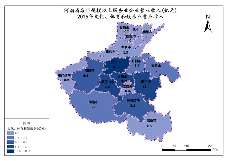 河南省文化、体育和娱乐业营业收入指经营文化、体育,娱乐活动的业务营业收入。文化业包括表演、播映、经营游览场所和各种展览、培训活动,举办文学、艺术、科技讲座、讲演、报告会,图书馆的图书和资料的借阅业务等。