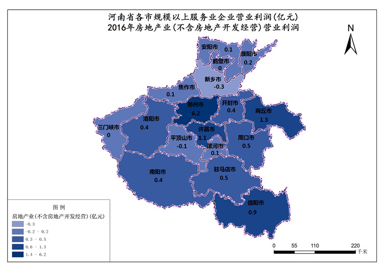 河南省2016年房地产业(不含房地产开发经营)营业利润最高值是郑州市,数值为6.17亿元,最低值是新乡市,数值为-0.38亿元。各市房地产业(不含房地产开发经营)营业利润总和是11.52亿元,平均值为0.67亿元。