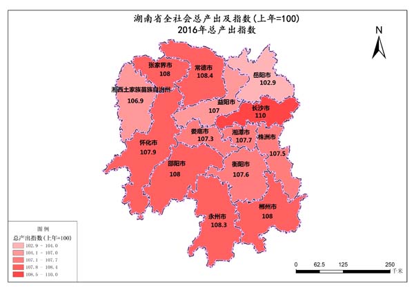 湖南省2016年全社会总产出指数最高值是长沙市,数值为110.0%,最低值是岳阳市,数值为102.9%。全社会总产出指数总和是1505.5%,平均值为107.53%。
