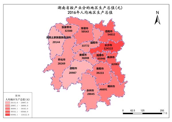 湖南省2016年按产业分的人均地区生产总值最高值是长沙市,数值为124122.0元,最低值是湘西土家族苗族自治州,数值为20144元。按产业分的人均地区生产总值总和是643773元,平均值为45983.79元。