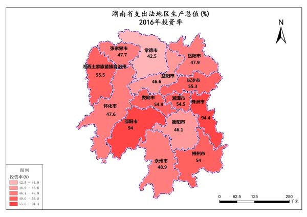 湖南省2016年支出法地区生产投资率最高值是株洲市,数值为94.4%,最低值是常德市,数值为42.5%。支出法地区生产投资率总和是789.9%,平均值为54.29%。