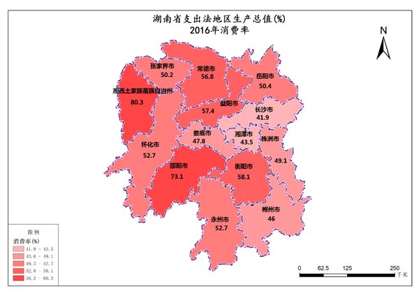 湖南省2016年支出法地区生产消费率最高值是株洲市,数值为94.4%,最低值是常德市,数值为42.5%。支出法地区生产消费率总和是789.9%,平均值为54.29%。