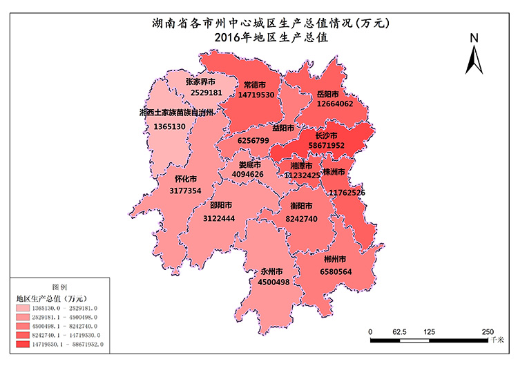 湖南省2016年地区生产总值最高值是长沙市,数值为58671952万元,最低值是湘西土家族苗族自治州,数值为1365130万元。地区生产总值总和为148919831万元,各市平均值为10637130万元。
