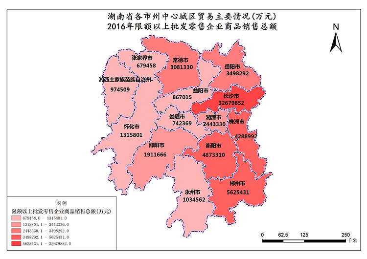 湖南省2016年限额以上批发零售企业商品销售总额最高值是长沙市,数值为32679852万元,最低值是张家界市,数值为679458万元。限额以上批发零售企业商品销售总额总和为64015917万元,各市平均值为4572565万元。