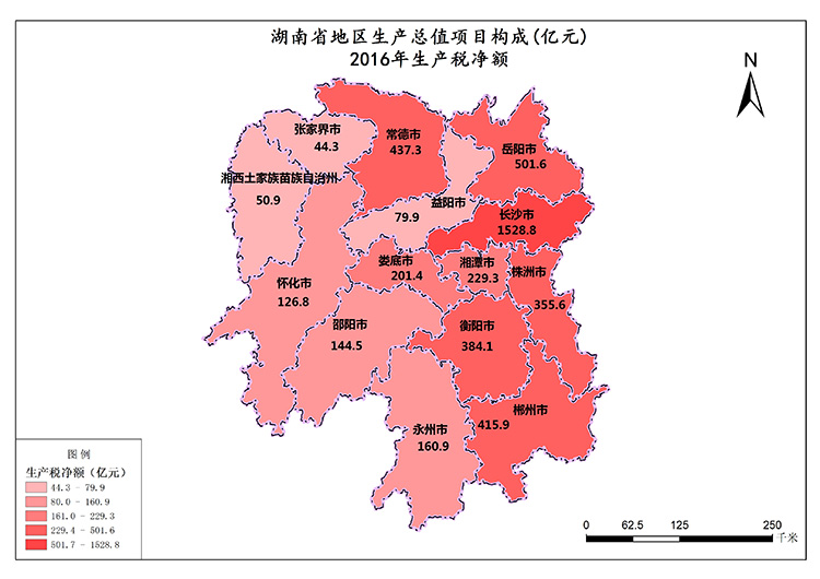 湖南省2016年生产税净额最高值是长沙市,数值为1528.77亿元,最低值是张家界市,数值为44.27亿元。生产税净额总和为4661.18亿元,各市平均值为332.94亿元。