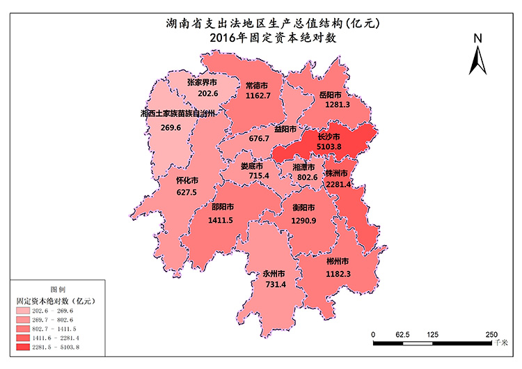 湖南省2016年固定资本绝对数最高值是长沙市,数值为5103.77亿元,最低值是张家界市,数值为202.55亿元。固定资本绝对数总和为17739.61亿元,各市平均值为1267.12亿元。