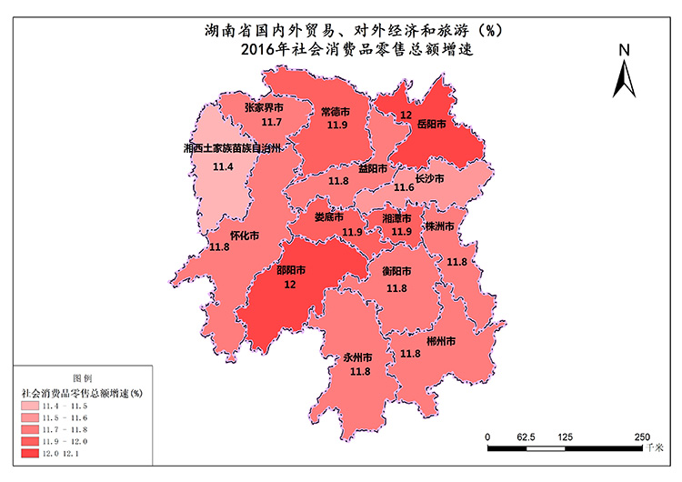 社会消费品零售总额增速就是社会消费品零售总额的增长速度。 湖南省2016年社会消费品零售总额增速最高值是邵阳市,数值为11.98%,最低值是湘西土家族苗族自治州,数值为11.40%。社会消费品零售总额增速总和为164.87%,各市平均值为11.78%。